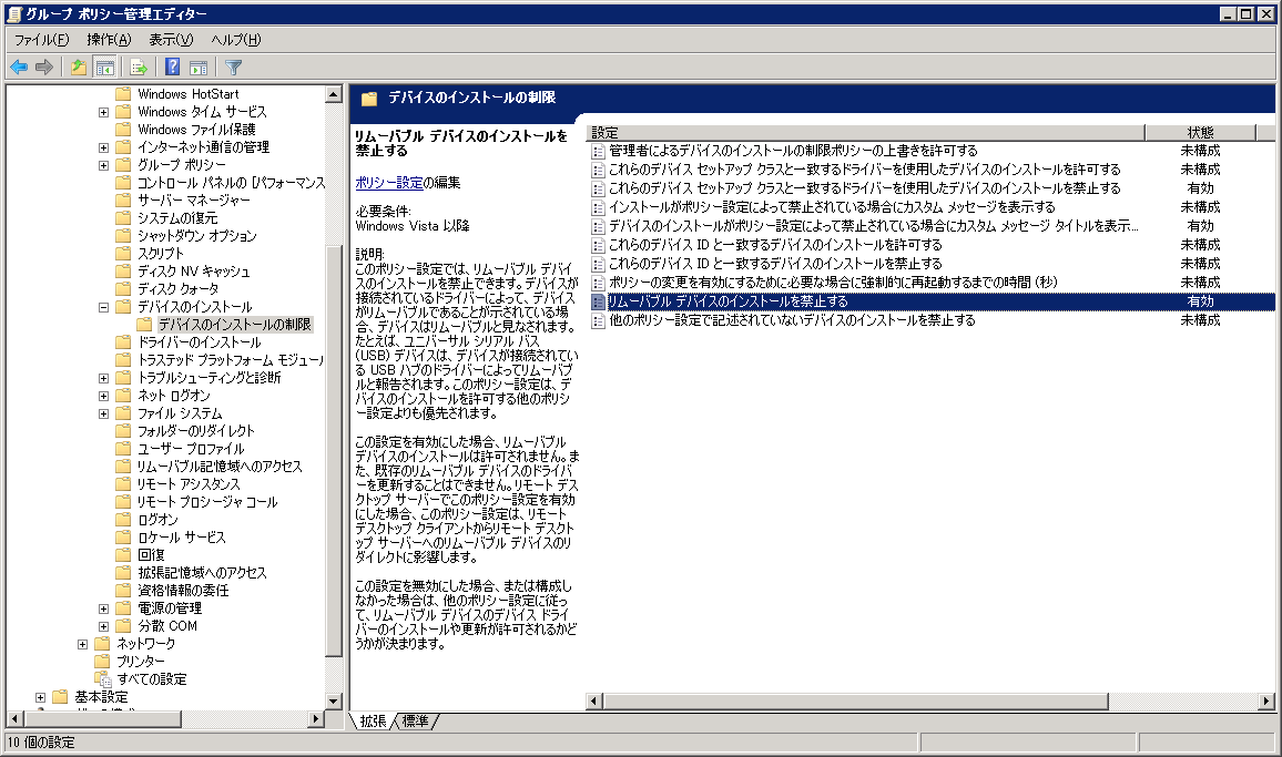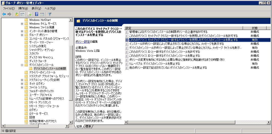「コンピュータの構成」-「管理テンプレート」-「システム」-「デバイスのインストール」-「デバイスのインストールの制限」へと進み、