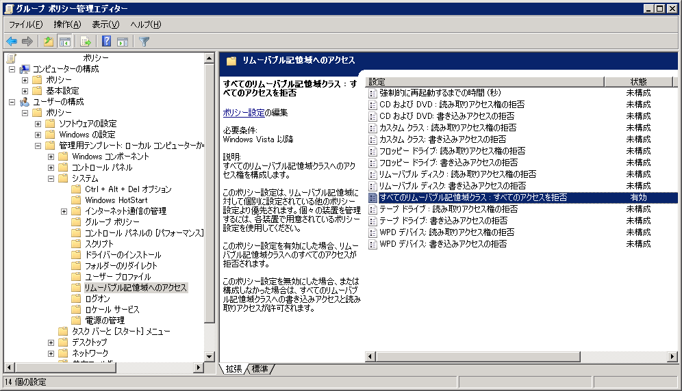 まずは、全てのリムーバブルのアクセスを拒否してみます。