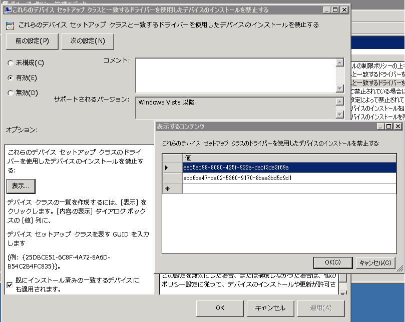 「これらのデバイスセットアップクラスと一致するドライバーを使用したデバイスのインストールを禁止する」を有効にします。