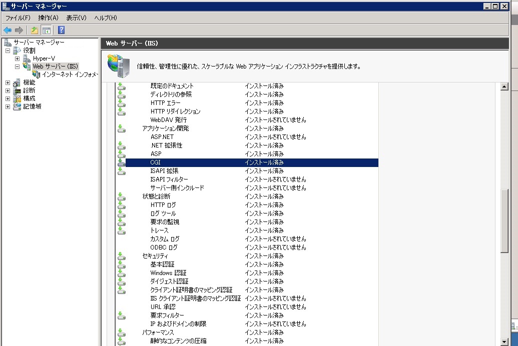 サーバーマネージャーにて、役割→Webサーバー(IIS)を選択します。下の方に機能追加の画面がありますので、CGIを選択します。