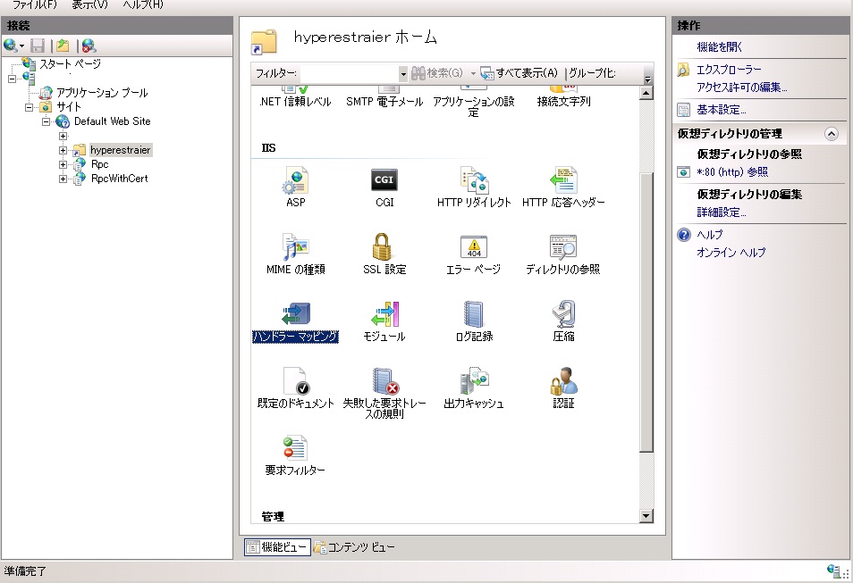 (1)IISマネージャの左のツリーから、<ホスト名>→サイト→Default Web Site→<仮想ディレクトリ名>を選び、「ハンドラマッピング」をダブルクリックします。