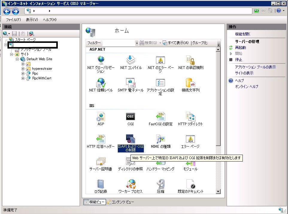 (1)IISマネージャの左のツリーから<ホストめ>欄を選び、中央の「ISAPIおよびCGIの制限」をダブルクリックします。