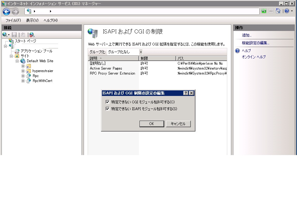 次に、IIS全体の設定で、特に指定していないEXEファイルのCGI実行を許可します。
