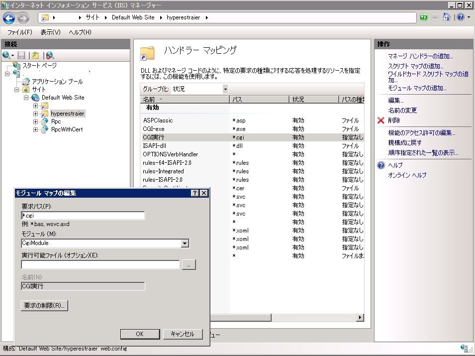 次に、IISで、追加した仮想ディレクトリ(私の場合、Hyperestraierフォルダをそのまま仮想ディレクトリに追加しました。)で、拡張子*.cgiをCgiModuleに結び付けるマップを追加します。