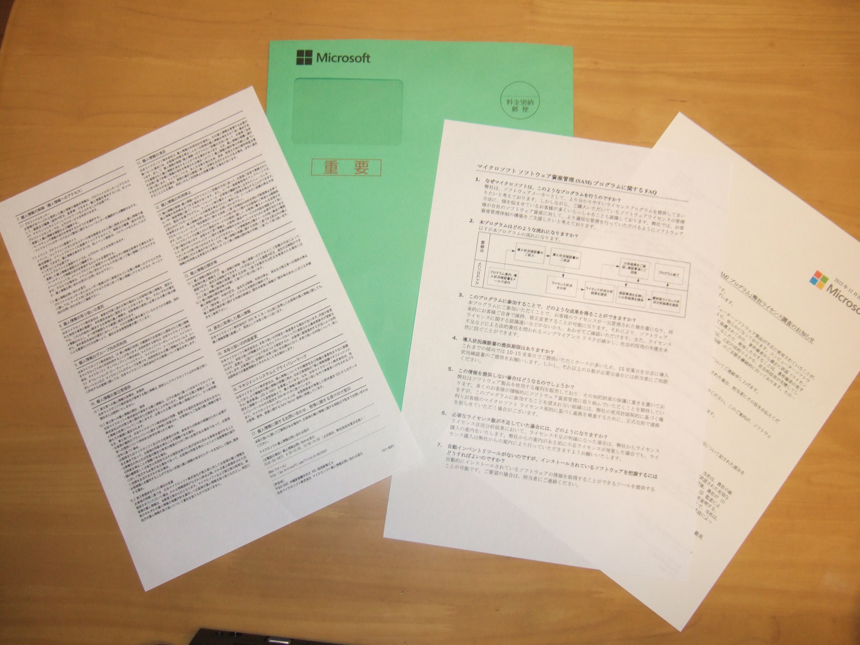 総務から「Microsoft」と書かれた緑の封筒を渡され、「まぁたなんかのセールスか?」と思いきや、うちにも来ましたよ、「ソフトウェア資産管理(SAM)プログラム」のライセンス調査。